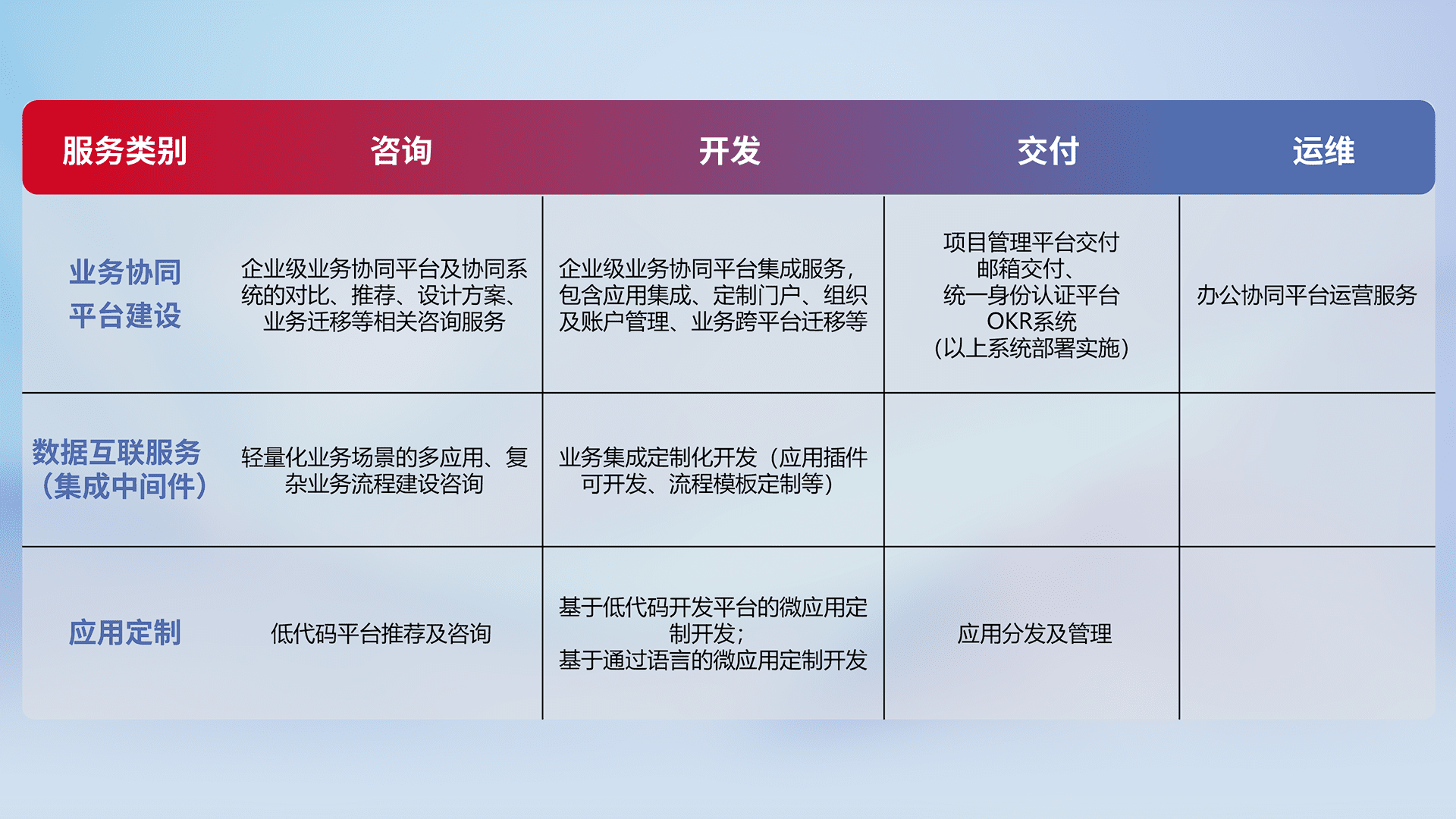 针对钉钉、、企微、、、IDaas等平台级产品提供产品的规划、、、、方案、、、、交付、、定制化开发等服务,,实现如统一协同办公、、、、智能客户服务、、、混合会议管理、、、智能数据查询、、、等业务场景,,,,实现数字化转型。。。