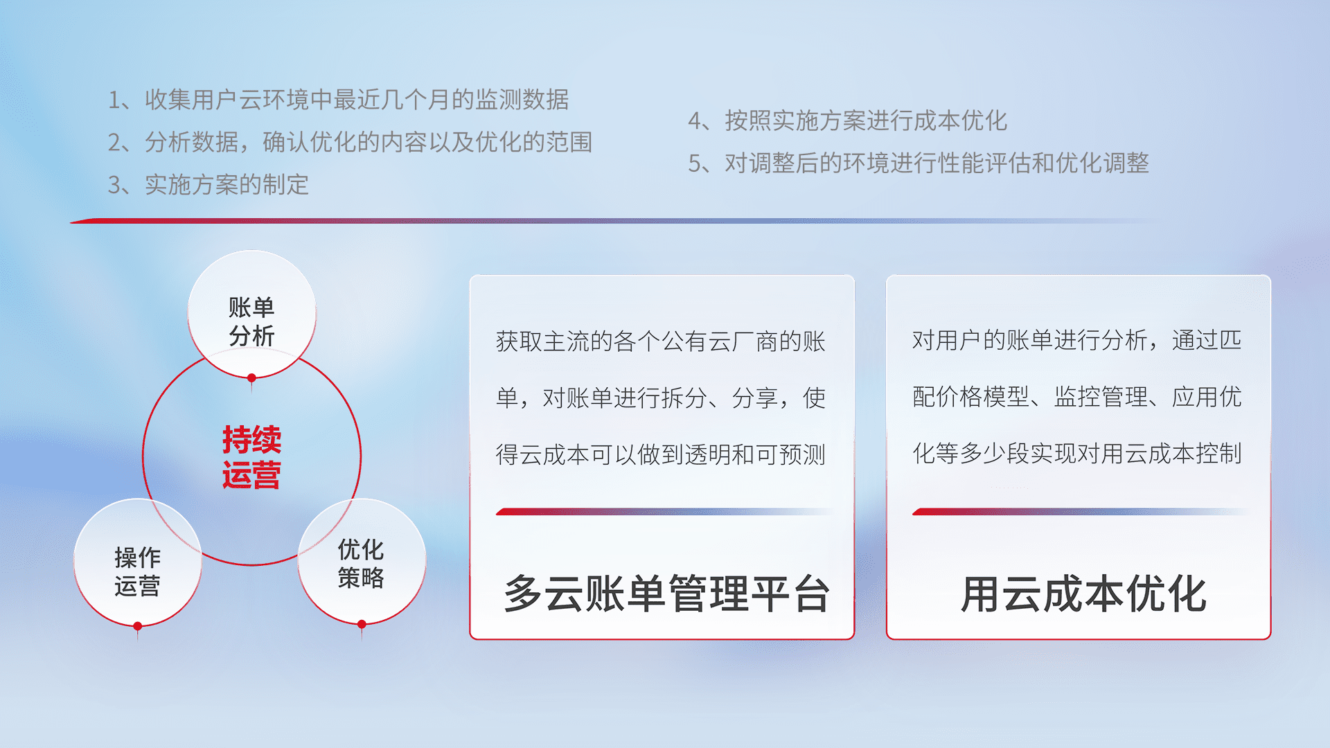 通过多云纳管,,以统一的资源数据模型把客户的云资源进行抽象和封装,,进而实现对多云资源的统一操作,,保障云资源管理的可靠性、、、稳定性与可用性。。。量身定制化运维内容,,,,配置、、开发运维、、补丁管理、、、、备份、、、、监控、、认证和访问管理、、审计和日常巡检等,,,,保障在用云过程中的可靠度,,稳定度以及高可用率。。。。